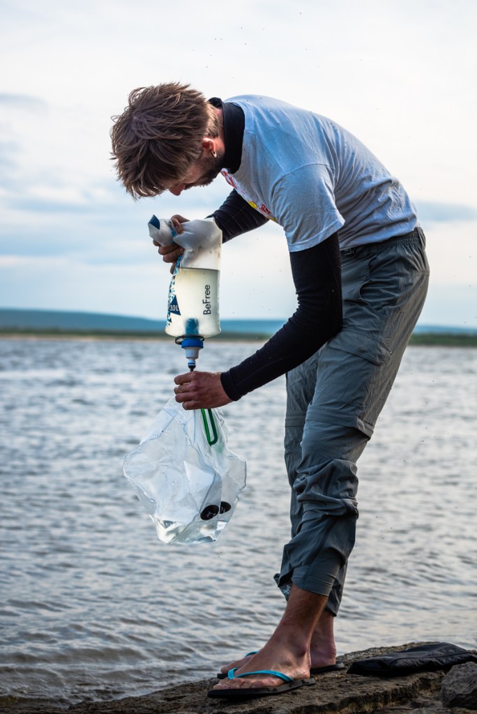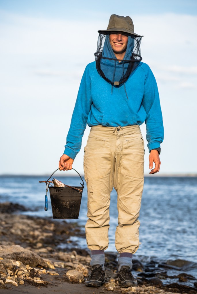 Virgile, équipé de son chapeau moustiquaire, le pantalon dans les chaussettes, s’attaque à la pêche sans plus tarder, pendant que les 4 autres se baignent et se douchent dans la Lena. Le paysage est grandiose, tout simplement. Après avoir traversé 150 kilomètres de plat, de forêts et de petits villages, nous voilà devant une immensité de sable et d’eau : la Lena à perte de vue, à droite comme à gauche, des arbres sur la rive opposée, et des falaises qui se perdent à l’horizon sur notre propre rive … Le camp est installé légèrement en retrait de la plage, dans une zone herbeuse, où un emplacement de feu nous indique les habitudes du lieu. On se rend vite compte que de nombreux plastiques et déchets en tout genre jonchent la plage et les alentours du camp, la notion d’écologie et d’éco-responsabilité ne semble pas autant développée ici que dans nos pays occidentaux.