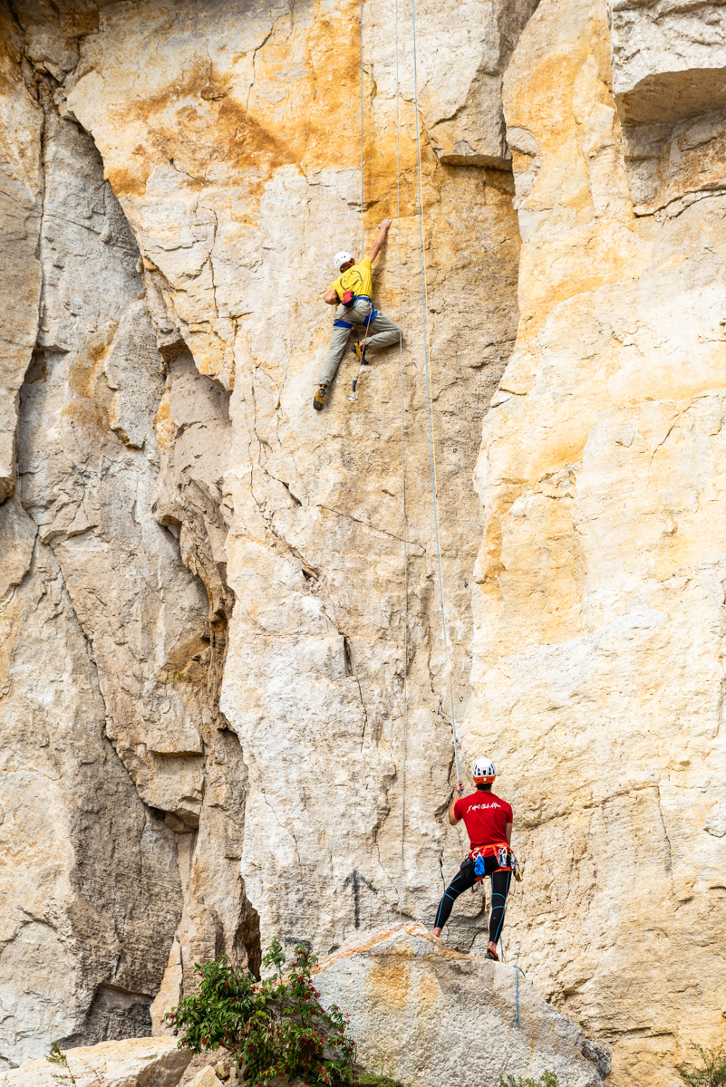 On profite de la corde que j’ai installé le 2ème jour pour mettre un relais au-dessus de la fissure, qui finira par devenir une belle voie école pour l’escalade traditionnelle. On essaye la ligne dure, et on estime que ça vaudra le coup de l’équiper si les locaux sont demandeurs de voies difficiles (quelque chose comme 7b, sur micro-réglettes cassantes).
