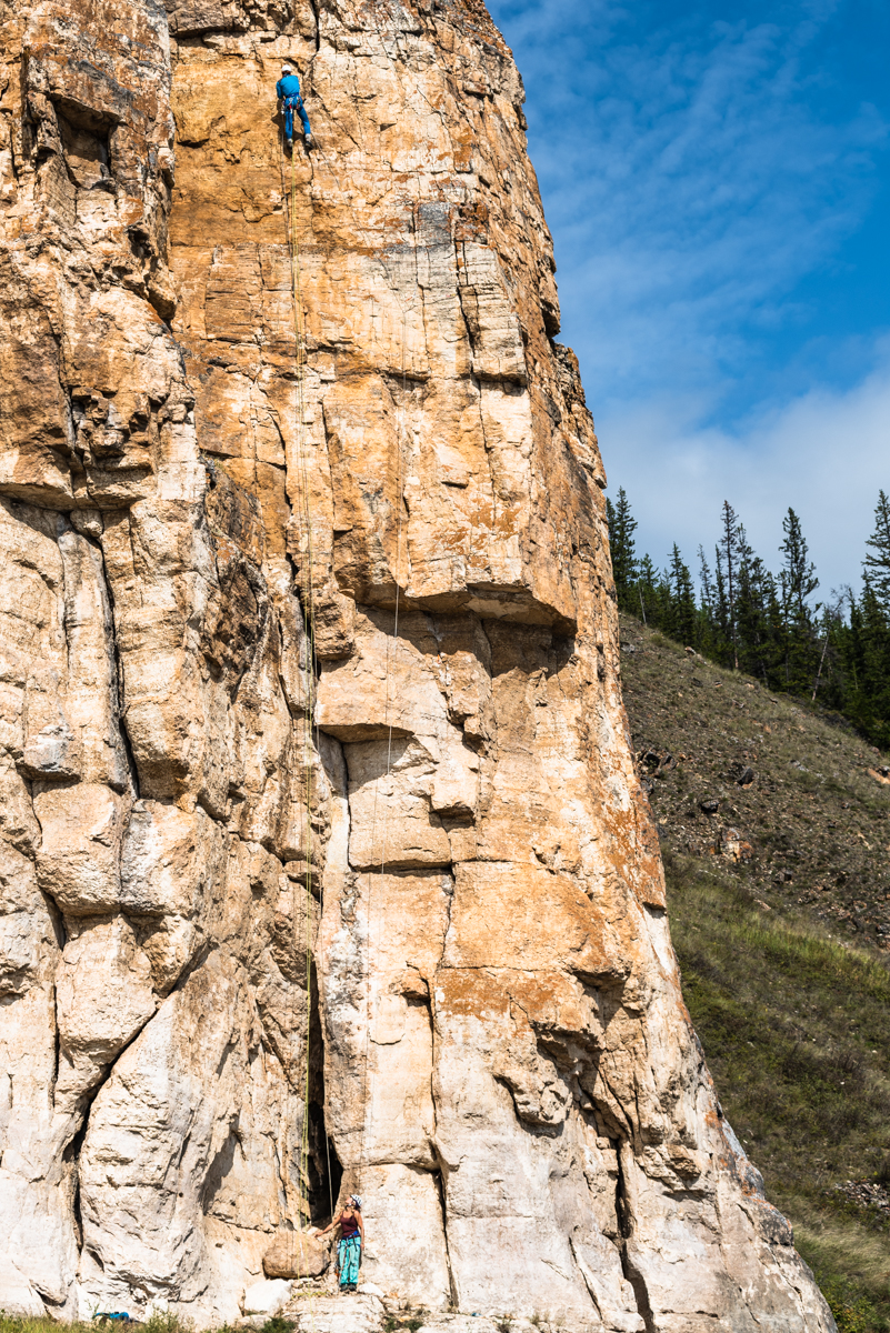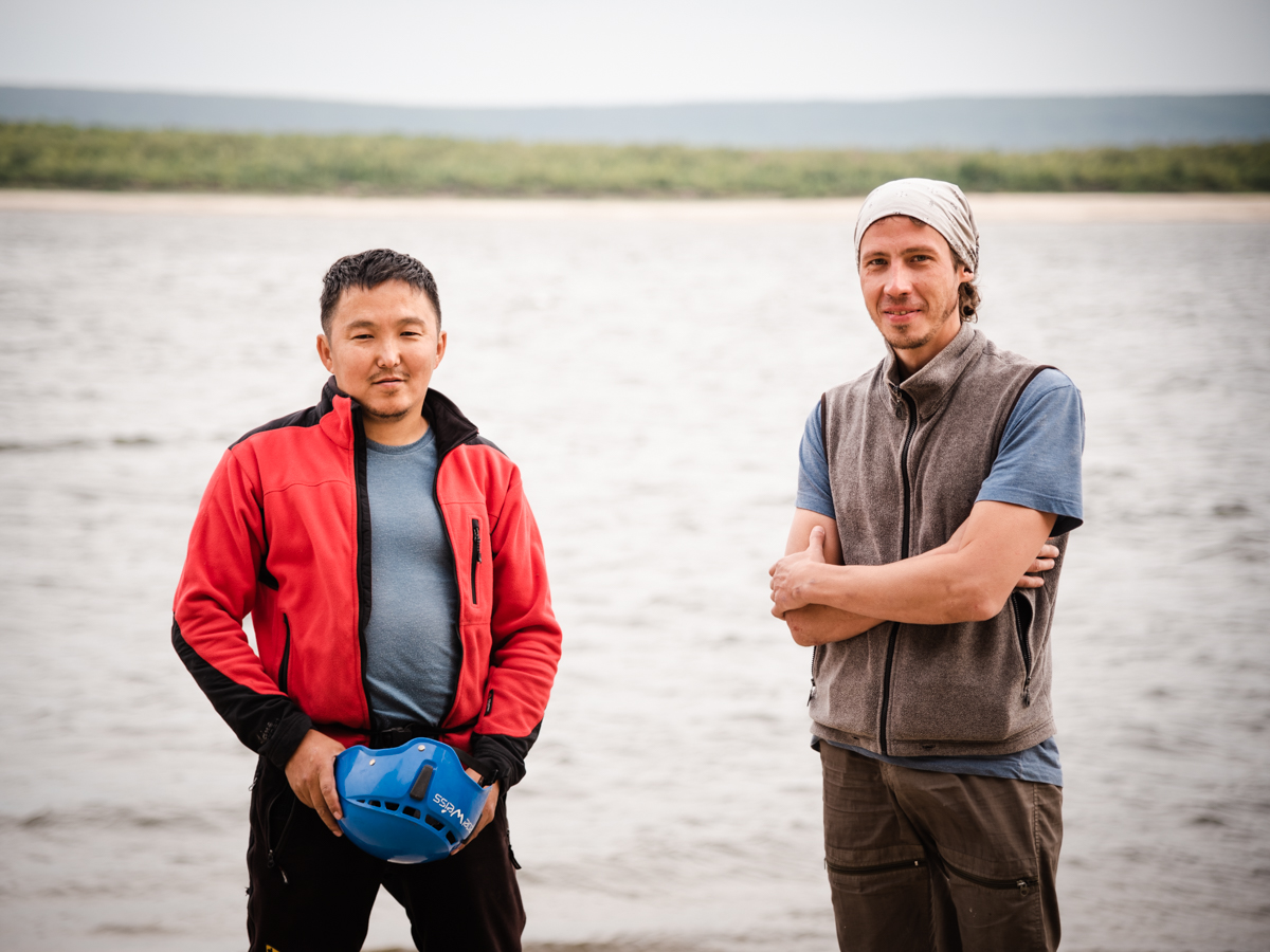 Virgile profite d’un instant paisible en fin de journée pour faire un cours de pose de coinceurs à Tima et Sasha, réellement demandeurs de nouvelles connaissances. Ils essayent même la voie école en tête, chapeau ! Ces derniers pourront donc apprendre à leur tour aux autres yakoutes l’escalade traditionnelle, en débutant sur une voie qui s’y prête assez bien.