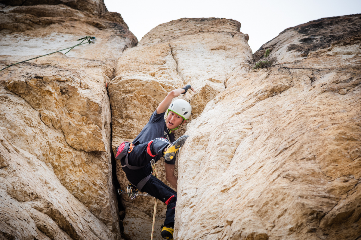 Virgile s’arme de l’ensemble des coinceurs, et s’attaque à l’escalade traditionnelle d’une ligne très belle et très pure, de 35 mètres de haut, au rocher plutôt bon et sableux. Pendant ce temps, Alizée et Théo équipent les lignes du pilier. Cela donnera deux belles voies, quelque chose dans le 6a et quelque chose dans le 6c.