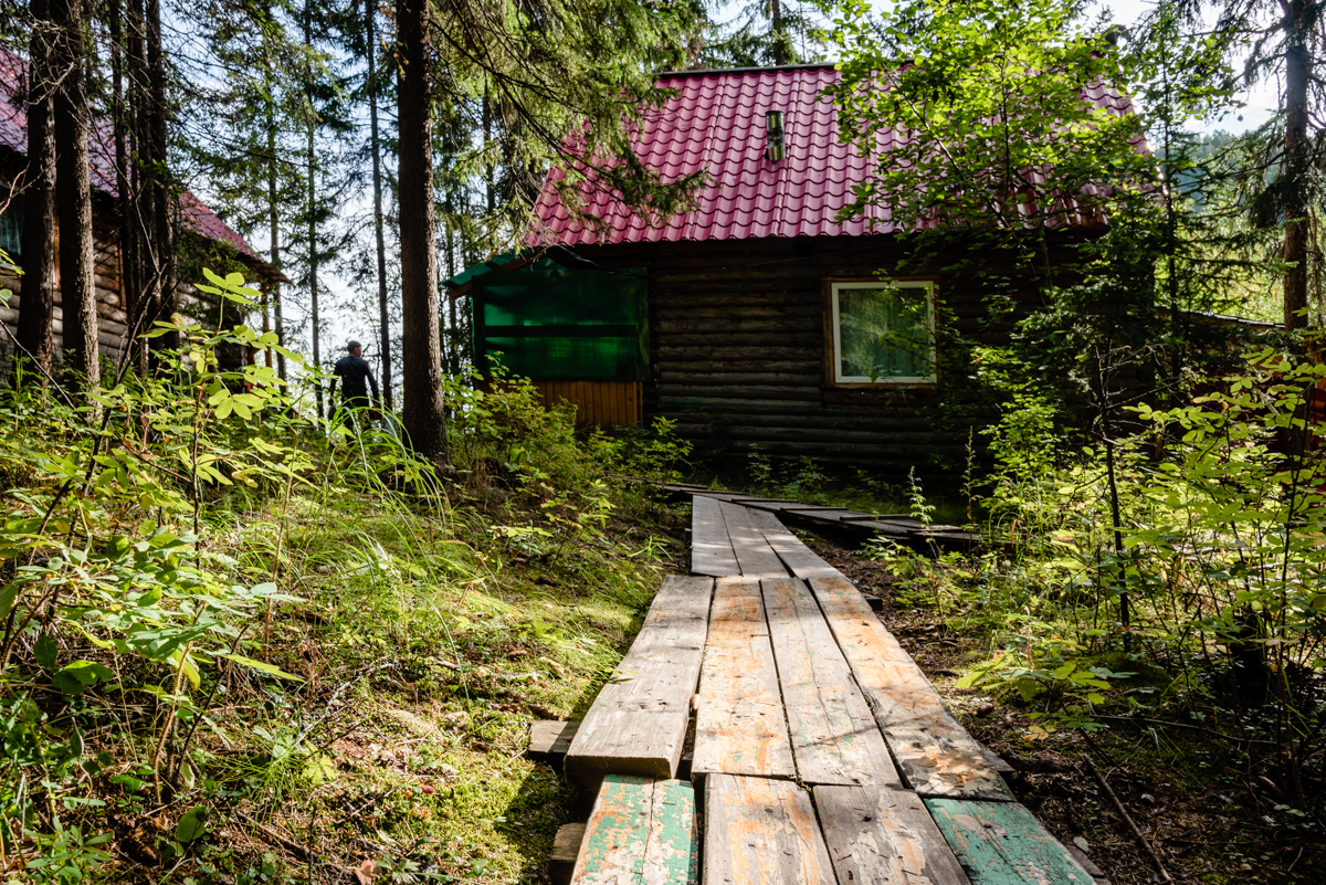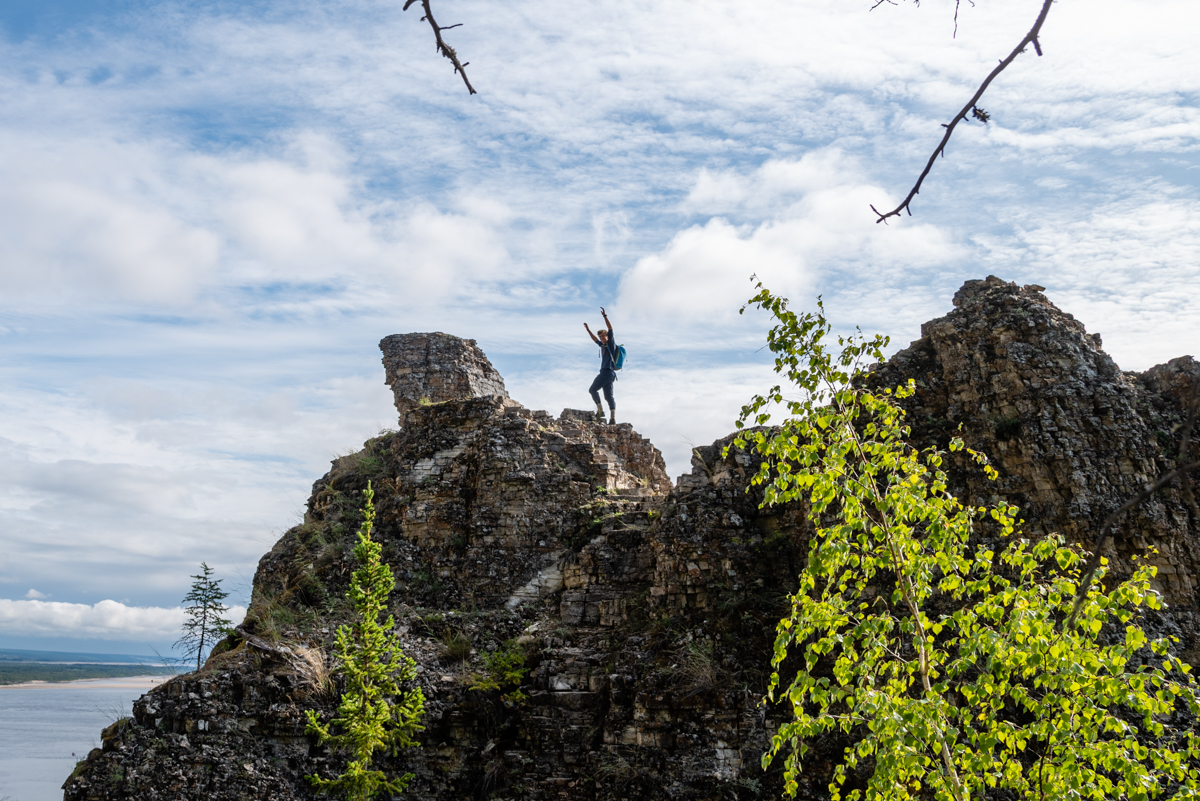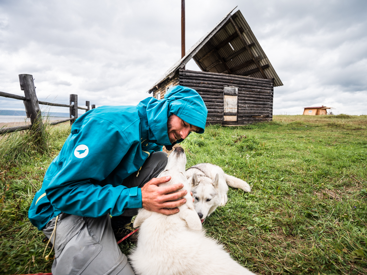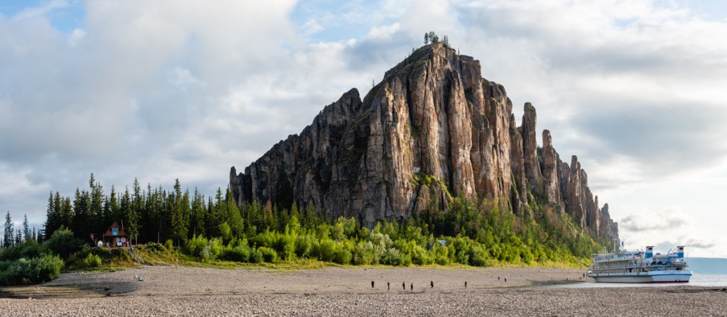 Il nous faut deux heures de Jeep, à même les plages et chemin de terre détrempés, pour atteindre Bottomaï. Le spectacle est de taille : derrière les 4 kilomètres de Lena s’étendent à perte de vue les piliers orangés, couvrant une distance de plus de 45 kilomètres. Bottomaï est un village typique de la Sibérie : des grandes maisons en bois, très espacées, en très petit nombre, sur un pré verdoyant et gigantesque bordant une plage elle-même imposante. L’ambiance est bretonne, avec beaucoup de vent et d’humidité. Les deux amis au bateau n’arriveront qu’en fin de journée, pour patienter Alexander nous fait louer une bâtisse à un paysan. On a accès à de l’eau chaude, ainsi qu’à des lits qui semblent déjà fréquentés par des souris.La traversée de la Lena est une étape magnifique de notre périple. On empile les bagages sur le minuscule bateau gonflable à moteur, en veillant à ce que rien ne puisse tomber, on enfile les gilets de sauvetage, Iana se cale entre deux sacs, et nous voilà parti pour … 10 minutes de traversée !! Plus on se rapproche de la rive sauvage, et plus les Colonnes grandissent. Elles sont somptueuses. L’exploration verticale nous démange d’ores et déjà. A l’arrivée, une belle surprise nous attend, il y a plusieurs cabanes où vivent les gardes du Parc National de Lensky Stolby. Les deux jeunes nous proposent de nous laisser la leur pour notre séjour, sous réserve qu’il n’y ait pas de touristes fortunés qui demandent à la louer. C’est un luxe auquel on n’aurait jamais osé rêver. Tout est plutôt trivial, en bois, avec peu d’espace, mais au moins on a de quoi être au sec, et allonger convenablement.